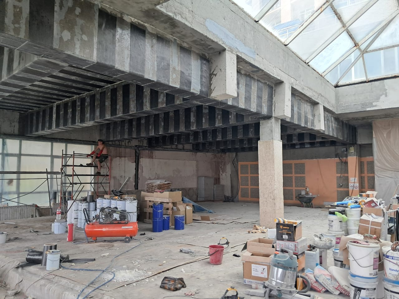 Демонтаж разрушенного защитного слоя бетона на плите перекрытия и зачистка арматуры от ржавчины. Покрытие очищенной арматуры антикорозионным составом. Усиление несущей способности ригельных балок перекрытия методом иньектирования эпоксидных смол в трещины.
